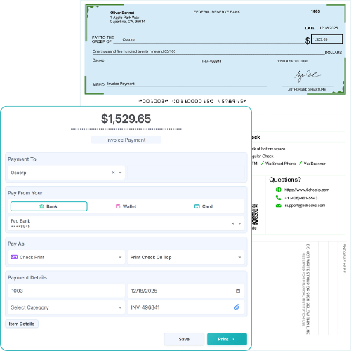 After writing check online, you can choose to print, email, or mail it. FiChecks keeps the process simple, using the same payment details no matter how you send it.