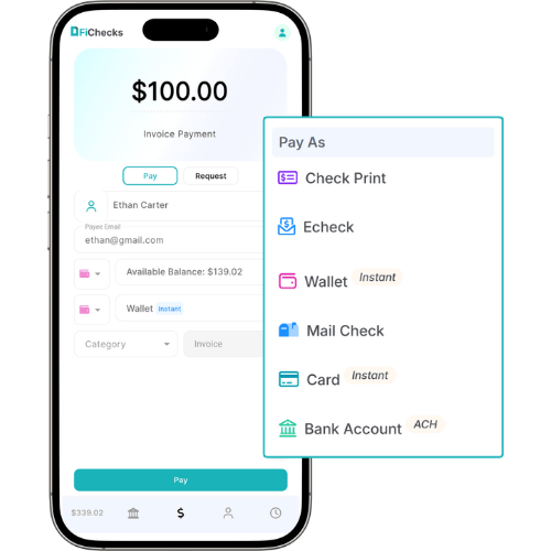 To transfer money, you choose a payment method like eCheck, ACH, wire transfer, digital wallet, or cards and enter the recipient details. The payment moves through the selected network and is delivered after verification. FiChecks helps users keep records of their transactions.