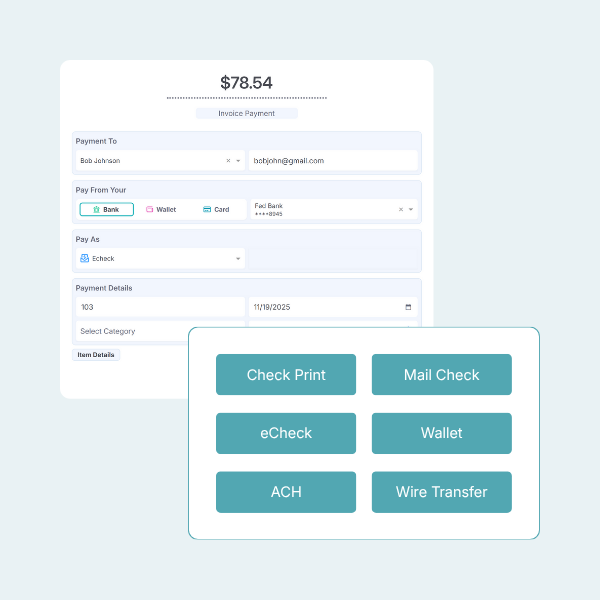 FiChecks lets you write checks, print them, mail them by USPS/FedEx, or send them as eChecks. You can also use ACH and wire transfer from the same platform. Everything stays in one place so you can handle any payment without switching tools.